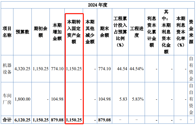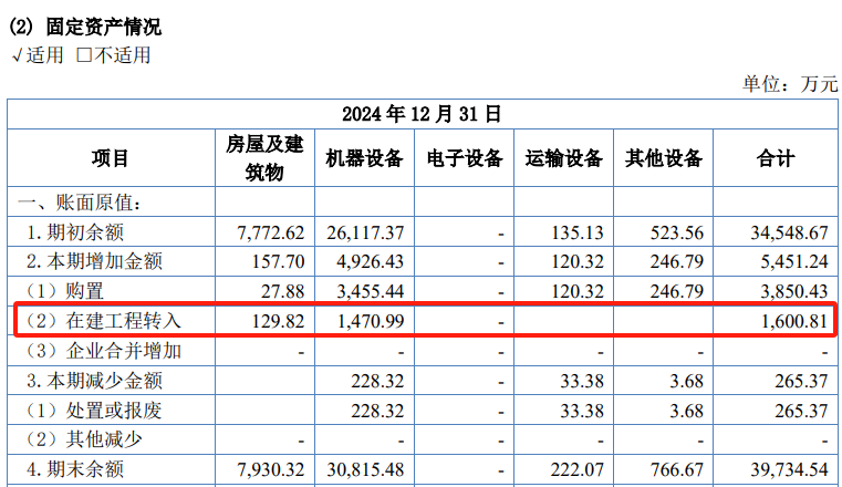 此外,根据招股书披露的固定资产信息,2024年由在建工程转入的固定资产账面原值多达1600.81万元,其中仅转入机器设备的在建工程金额就高达1470万元。但与此同时,在建工程科目明细中披露,2024年结转固定资产的项目仅包括机器设备1150.25万元,与固定资产信息披露存在明显矛盾。